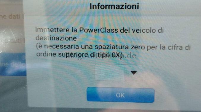 “Immettere la PowerClass del veicolo di destinazione (e necessaria una spaziatura zero per la cifra di ordine superiore di tipo 0X).