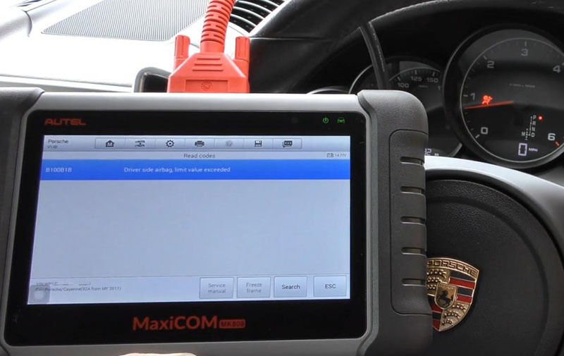 Back to Homepage, now we have the airbag light showing on the dashboard. Again click on “Diagnostics” and select our Porsche automatically. So in this case it’s airbag. Click “Read codes”, so we’ve got B100B1B and “Driver side airbag limit value exceeded”.