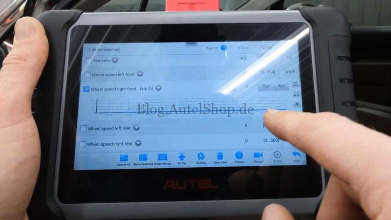 I checked the wheel speed sensors in the ABS module. The graphing feature is awesome for spotting glitches or drop-outs while driving. You can even merge up to five different data pids (like engine speed and oxygen sensors) into one colored graph to see how they interact.