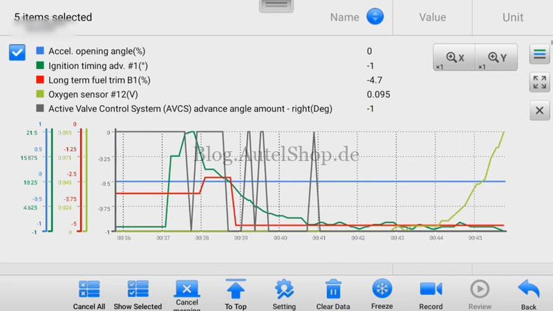 - Live Data & Graphing – Monitored real-time engine data, including O2 sensor response. Supports up to 5 live graphs simultaneously.