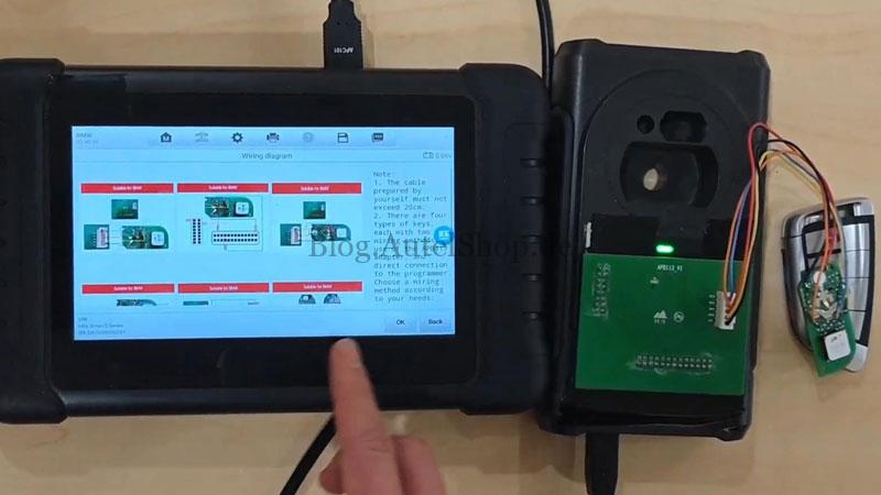 - Carefully follow the specific on-screen wiring diagram displayed on your Autel tablet to connect the working key to the APB113 Adapter.